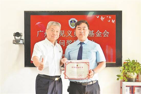 广州市见义勇为基金会理事长蔡巍(左)为蒋新民(右)颁发慰问奖励证书 通讯员供图