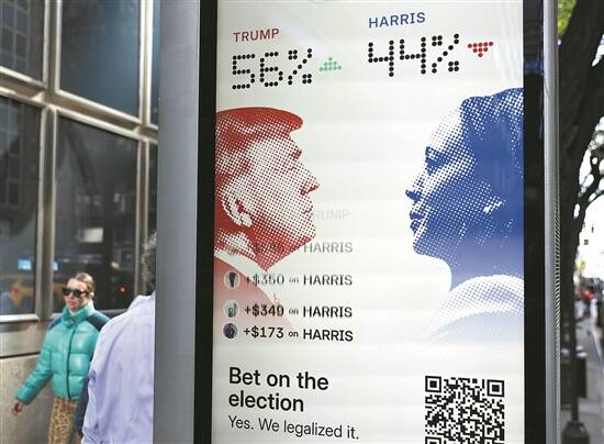 当地时间2024年10月17日,美国纽约,街头的显示屏上打出了总统大选投注广告 视觉中国供图