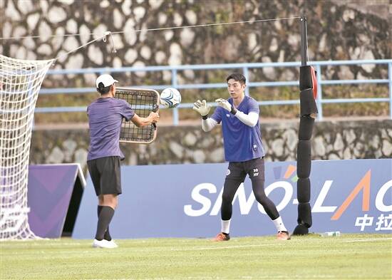 广州安华队门将侯宇(右)在训练中 广州安华足球俱乐部供图