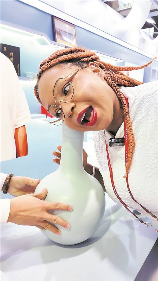 梅丽被另一家展位上的天青色汝窑瓷器深深吸引,工作人员刘佳成邀请梅丽将耳朵贴近瓷器瓶口。听到瓶中的声音时,梅丽惊讶地说:“这种声音就像山洞里回荡的风声!”