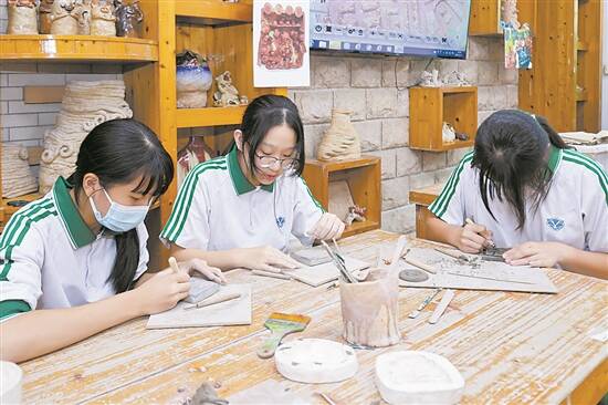当天,与会人员还观摩了广州市九十七中晓园学校的特色陶艺课程,从陶艺工作坊、到陶艺展厅、到楼梯一角、校道,校园里每一个角落都充满了陶艺的元素。学校校长陈红燕表示,学校结合“以陶养情,以美育人”的办学思路,践行“炼土为陶,育人成器”的办学理念,以陶艺作为特色课程的同时,积极开展各项劳动教育课程,打造五育融合生态劳动课程体系。