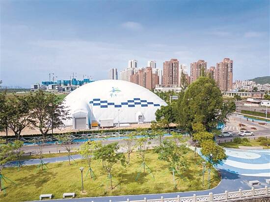 羊城晚报讯 在珠海市金湾区平沙镇平塘河边,一个倒碗状的“大气球”和两边的平塘河、亲水跑道相得益彰,引人注目。据悉,这是珠海首个面向公众开放的气膜运动馆,计划在12月投入运营。