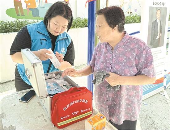 社工向社区居民介绍“阳光创口贴”护理箱