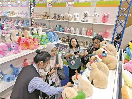 在一家来自江苏的毛绒玩具企业的展位,印尼记者停留了很久,工作人员向他们介绍了企业和产品的情况,该工作人员表示,东南亚是该公司重要的产业基地和市场。