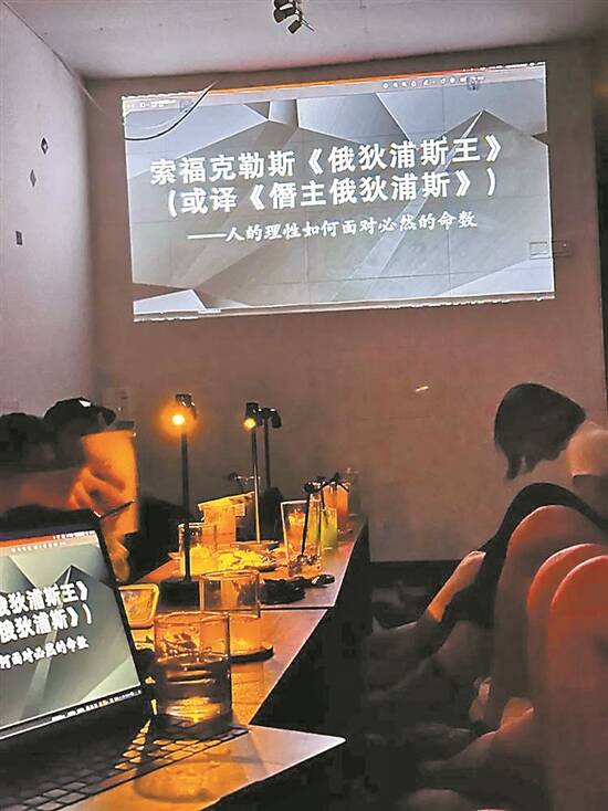 在广州天河客运站商圈的一间复式公寓里,灯光昏黄,阿达趴在二楼的栏杆上,看着楼下一群年轻人围坐在地上。他们时不时拿起酒杯小啜一口,坐在投影幕前的一个人正指着PPT,进行着一场题为《索福克勒斯〈俄狄浦斯王〉——人的理性如何面对必然的命数》的学术分享。