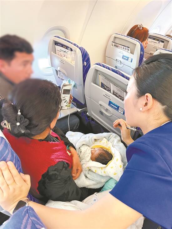 飞行途中,机组人员时刻关注婴儿的状况 通讯员供图
