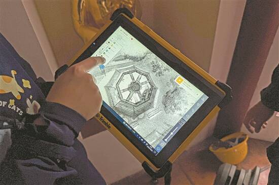 每完成一个站点,就要将其和上一个站点的点云数据进行无缝拼合,直至形成一个完整的三维建筑模型。记者现场看到,手簿屏幕上显示采集完成的站点已有一百多个,古塔底部数层的三维模型已经初步形成。