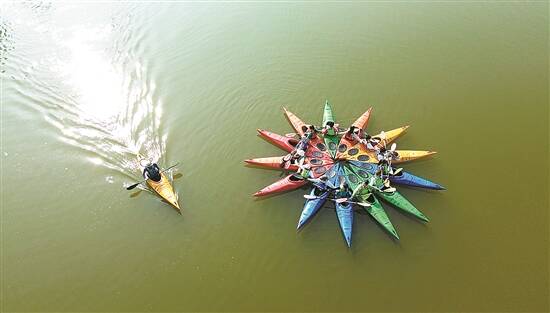 10月12日,广西贺州学院学生在学校惟勤湖进行皮划艇训练。为增强学生学习兴趣,拓展学生实用技能,学院开设“灵、小、水”特色体育课,受到学生欢迎。