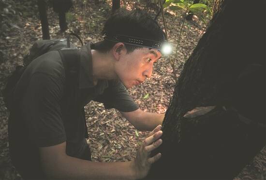 王苇杭头戴探照灯,在树木园中寻找夜间出没的昆虫