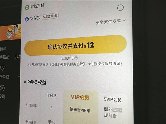 记者注意到,优酷的会员包括VIP会员和SVIP会员两种。每种会员不同价位,享受不同权益。目前,其VIP会员有连续包月、年卡、半年卡、连续包季、季卡、月卡六种套餐,其中最便宜套餐12元,最贵套餐118元;SVIP会员有连续包月、年卡、季卡、连续包季、半年卡、三年卡、月卡套餐,其中最便宜套餐同样是12元,最贵套餐则是518元。除了“热播剧集、支持设备、登录设备、点播内容、身份标识”不同之外,VIP会员和SVIP会员享有同样的“功能特权”。其中,“功能特权”包含“广告特权”和“帧享影音”两部分,但在“购买会员”页面中也仅标注了这8个字而已,并未说明这两部分的具体服务内容。