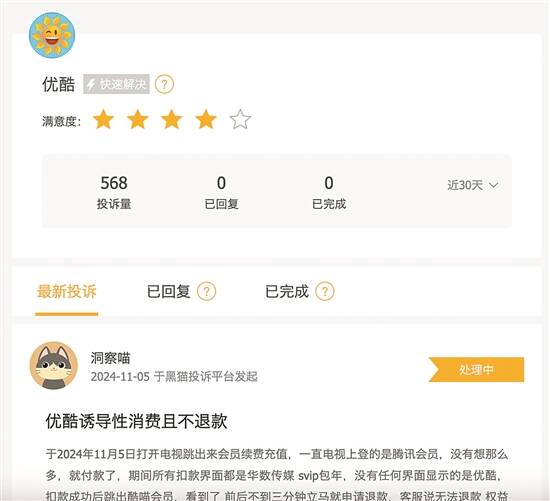 记者在黑猫投诉中搜索发现,截至目前,包含搜索词“优酷”的投诉量高达3万多条,投诉内容大多涉及自动续费、广告特权、虚假广告等。记者在商家页面还发现,优酷近30天内的“投诉量”为568条,但“已回复”和“已完成”投诉均显示为“0”。