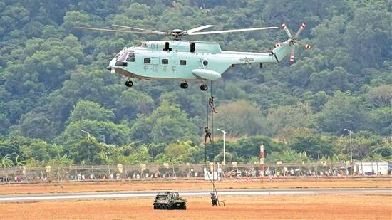 10日,海军直-8C运输直升机在广东珠海进行适应性飞行训练,陆战队员快速滑降 新华社发