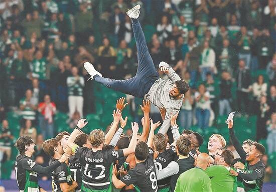 阿莫林(上)上周在欧冠比赛中率队获胜被球员抛起 新华社发
