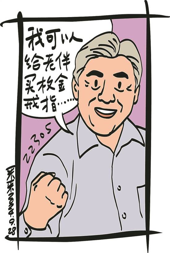 让老田过意不去的是,当年和老伴结婚,因家里生活困难,他只给老伴买了两套衣服、一双鞋,就把人娶了过来。但是,老伴从没说过一句怨言。后来,孩子们大学毕业后有了工作,日子渐渐也好起来,老田就动起了心思,总是去金店晃悠,想买枚金戒指补偿自己对老伴的愧疚,但老伴知道后说啥都不同意。无奈,老田只得把这份心思放在了心里。