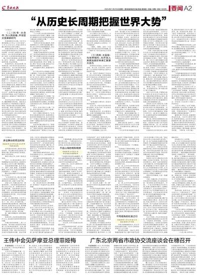 魏小东表示,北京市政协将以深入贯彻落实习近平总书记在庆祝中国人民政治协商会议成立75周年大会上的重要讲话精神为主线,从努力构建体系化、常态化的大学习格局,切实提高协商议政质量和水平等方面做好明年工作。广东省政协在加强专门协商机构建设、充分发挥专门委员会基础性作用等方面积累了不少好经验好做法,值得北京市政协认真学习借鉴。北京与广东都肩负着“走在前列”的光荣使命,北京市政协将以此次考察交流为契机,与广东省政协进一步加强交流合作,坚持互学互鉴、同心协力,共同推动新时代新征程人民政协事业高质量发展,为共创京粤合作发展新局面贡献政协智慧和力量。
