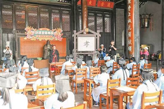 沙湾古镇中,已经700余岁的何氏大宗祠每年都会为一群稚嫩的小娃娃们举行一场“传统开笔礼”。据史料记载,自清代以来,何氏族人便传承了“开冬学”的传统习俗,包括写“人”字、击鼓鸣志、巡游文峰塔、习读《三字经》等。在独占鳌头、鱼跃龙门的美好愿景中,孩子们跟随鳌鱼跨过仪门,响亮的读书声不仅开启了“古今穿越之门”,也赋予何氏大宗祠这位年迈的“长辈”以全新的生命力。