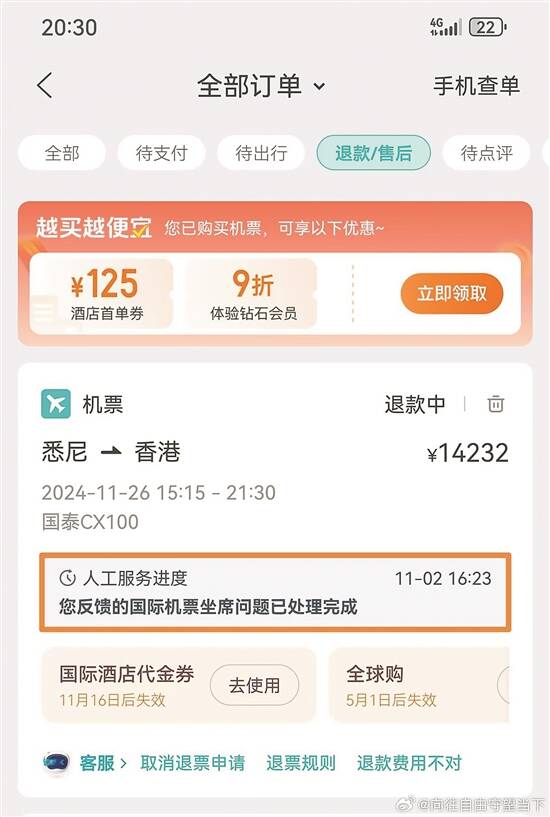 据周先生的讲述,2024年11月2日10时24分,他在“去哪儿旅行”App平台上,帮朋友购买了4张从悉尼飞往香港的机票(起飞时间为11月26日15时15分),每张机票票价为3558元(含税及保险),航班为国泰航空CX100航班。他通过平台绑定的信用卡支付了全部款项14232元。