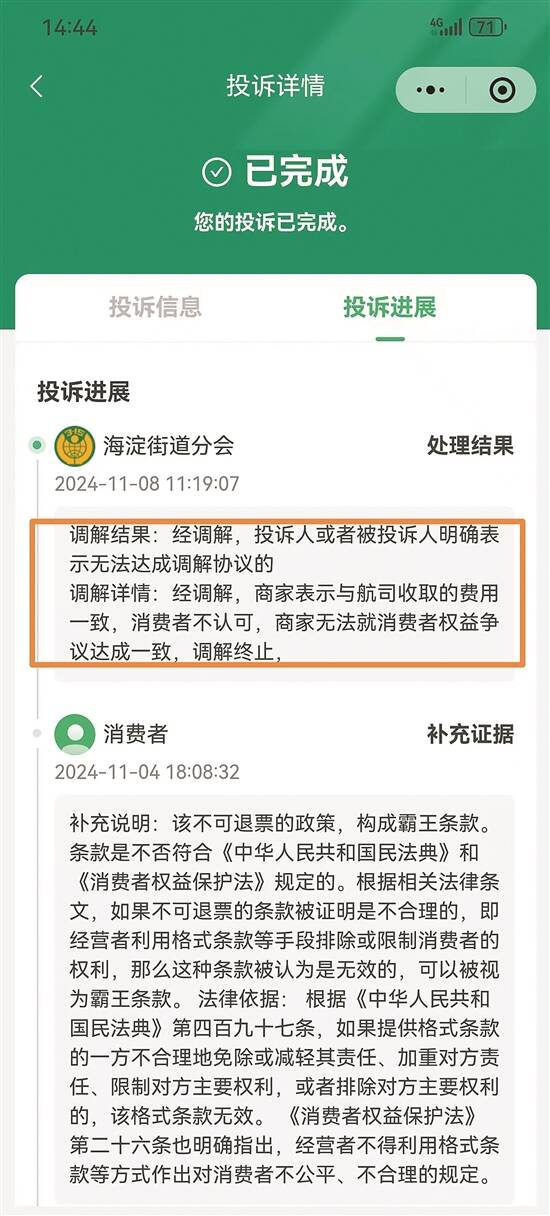 事发后,周先生于11月2日和3日共两次通过中国消费者协会官方微信中的“全国消协智慧315”板块投诉北京趣拿信息技术有限公司,一次“和解失败”,一次“终止调解”。“海淀街道分会”11月8日给出的处理结果显示:“经调解,商家表示与航司收取的费用一致,消费者不认可,商家无法就消费者权益争议达成一致,调解终止。”