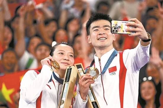 郑思维(右)和搭档黄雅琼在巴黎奥运会上庆祝羽毛球混双夺冠 图/视觉中国