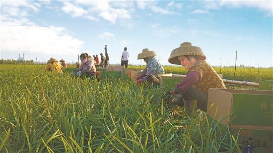 田间,十多名工人正在紧张劳作。他们有的拿着小弯刀收割韭菜,有的将整理好的韭菜熟练地装进印制精美的纸箱里,然后再搬到田边的农用车上。