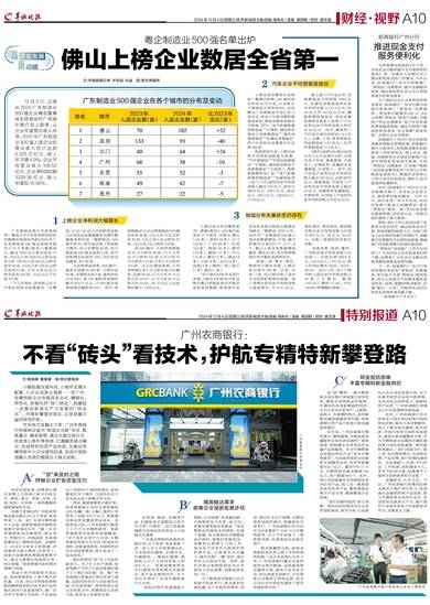 近年来,广州农商银行聚焦重点、精准施策,不断拓展金融服务实体经济发展的广度和深度,积极健全完善多层次金融产品和服务。针对专精特新企业推出特色产品“金米专精特新贷”,为具备资质的企业提供专项融资支持,信用贷款额度可达1亿元。截至今年11月末,专精特新贷款余额超190亿元,客户数超900户。此外,该行还创新推出先进制造业系列信贷产品、轻工及一般制造业系列信贷产品,聚焦制造业细分产业分类,精准赋能企业发展。