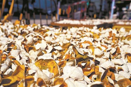 陈皮,要越“陈”越好,因此每年这个时候,除了新鲜晾晒的新果皮之外,还要把陈年果皮也拿出来翻晒一下,有助于陈皮更好地陈化。记者观察到,今年新晒制的陈皮一百多元一斤,而年份越久、颜色越深的陈皮则更贵,每斤三四百元不等。