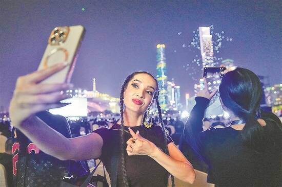 外国嘉宾打卡“广州之夜”表演 羊城晚报记者 蔡嘉鸿 摄