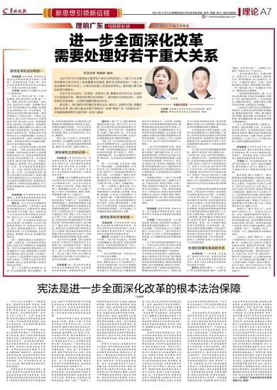 宪法的生命在于实施,宪法的权威也在于实施。党的二十届三中全会审议通过《中共中央关于进一步全面深化改革、推进中国式现代化的决定》强调:“必须全面贯彻实施宪法,维护宪法权威,协同推进立法、执法、司法、守法各环节改革,健全法律面前人人平等保障机制,弘扬社会主义法治精神,维护社会公平正义,全面推进国家各方面工作法治化。”“健全保证宪法全面实施制度体系,建立宪法实施情况报告制度。”因此,进一步全面深化改革、推进中国式现代化,与进一步加强宪法实施、推进依宪治国和依宪施政是同步推进、同频共振、相得益彰的关系。进一步全面深化改革、推进中国式现代化要取得新成就,宪法实施就要谱写新篇章、达到新水平。