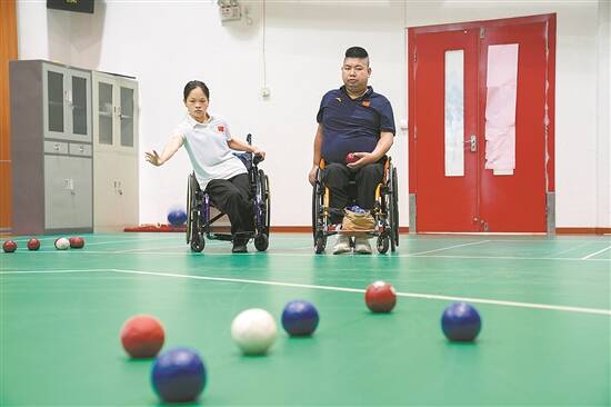 训练场上的广越楚神色严肃认真,摆动手臂用力挥球,将对手的球击远。“好球!”郑远森在旁边喝彩,随后掷出自己的球。相互比赛、捡球构成了郑远森和广越楚在训练馆的日常。“大战”经验丰富的郑远森常常帮助广越楚训练,他们都期待在明年家门口的这场全国残运会取得好成绩。