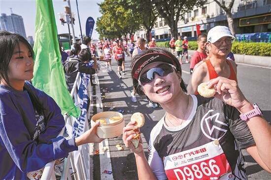 在最低气温仅有11℃的当日,一碗市民递过来的姜茶成为广马选手李国权心中的“白月光”。“我在全国跑了这么多地方的马拉松,广州的‘私补’永远是最好的。”李国权说,“当时这个阿姨生怕选手们冻着,一直喊‘热茶热茶’,实在太感动了,广州人淳朴的热情化成了最踏实的支持,温暖着每一位跑友。”