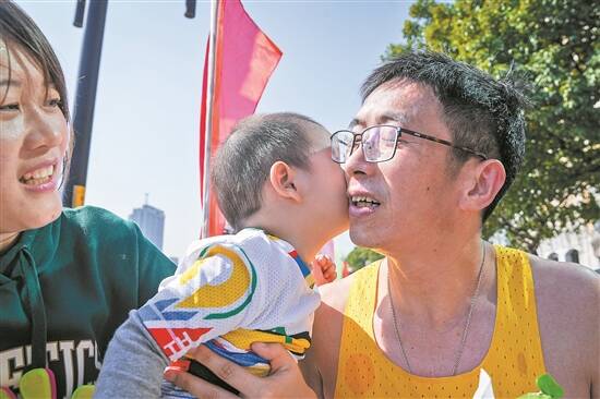 一人跑马,全家助阵。广马选手马党飞在赛道34公里附近与家人相遇,儿子为父亲加油鼓劲。