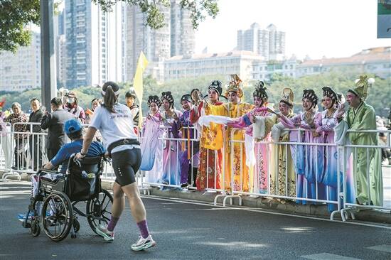 市民身穿粤剧服装在赛道旁为广马选手加油鼓劲