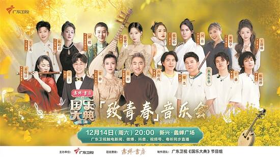 广东卫视《国乐大典》全国巡演——“致青春”音乐会自2022年在广州开启全国巡演,先后走过肇庆、茂名信宜、韶关乳源等站。12月14日,巡演将在云浮市新兴县蠡蝉广场上演,与新兴县第一中学的师生共同呈现一场大型文化展演。