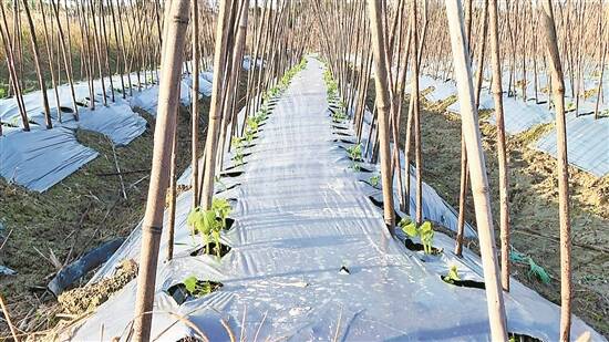 近日,记者来到塘口镇竹迳村,看到该村的油豆田里,工人们正在种植油豆,他们分工合作,有的负责铺设地膜,有的负责铺设灌溉水管,有的负责往坑里种豆,一派忙碌的劳作景象。