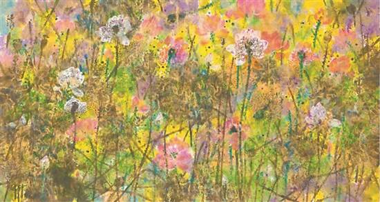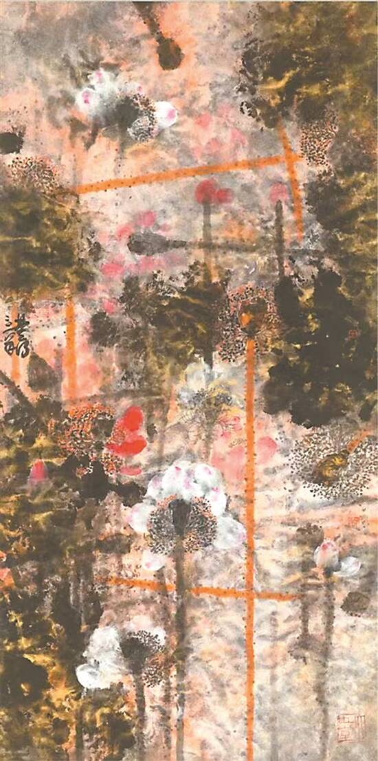与传统中国画崇尚“留白”不同,林天行笔下的荷花图景大多饱满充实,以色彩、意蕴或律动,描摹荷花在池上田间的绽放与凋谢,拓宽观者想象空间。