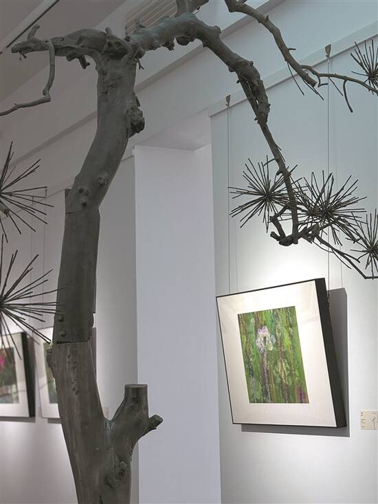 沿楼梯往二楼画廊走去,步阶尽头处悬挂咏荷画作《望远》。白荷、粉荷在彩墨映衬中愈显灵动,花瓣边缘积墨处透出明黄调,色彩对比营造的视觉层次配合由远及近的脚步,预示着观者将走进“百荷之境”。