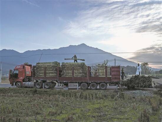一辆辆装满了甘蔗的大货车,迎着残阳,驶往远方……