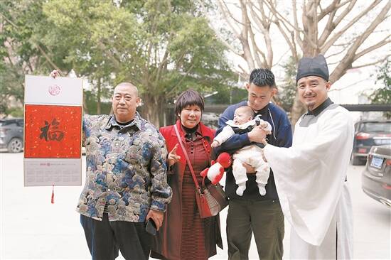婴儿的百日宴上,“李白”为丰哥(左一)的孙子读诗送祝福