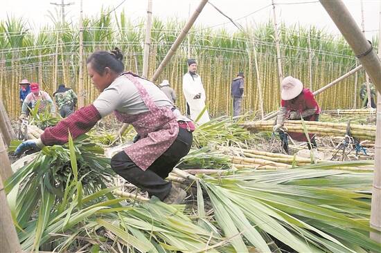 一群砍甘蔗的人,男的砍,左手握住一根青皮果蔗,右手举起一把铁铲(像一把凿子),手起凿下,用手一扯,一根几斤重的甘蔗乖乖躺下……女的绑,两个铁架架两头,甘蔗横卧在上面,十根八根就一捆,专业人的手脚,非常麻利,搬运装车……如此诗意般的劳动场景,让人心潮澎湃。