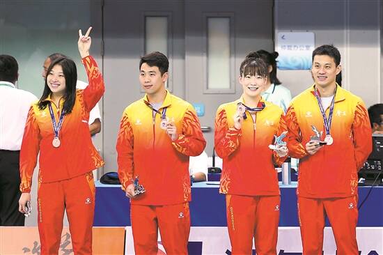 周嘉威(右一)在2017全运会4×100米混合泳接力比赛颁奖仪式上 图/视觉中国