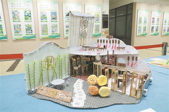 同样10岁的廖靖尧则用粘土和其他材料“搭建”了一座博物馆。“岭南地区的鸡仔饼、杏仁饼、老婆饼和盲公饼被称为‘四大名饼’,我就发挥想象力做了一个微缩型名饼博物馆。博物馆里包括制作点心的工作区、售卖文创公仔的文创区,我还精心制作了象征着‘步步登高’的旋转楼梯,参观者来到二楼品尝区可以现场品尝美味点心。”