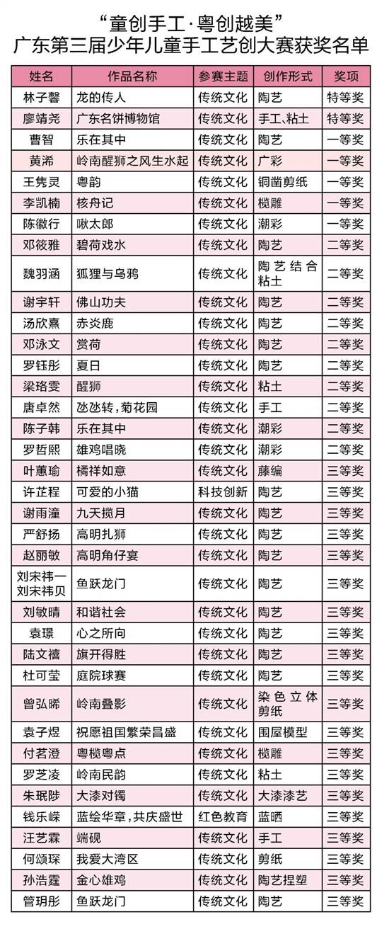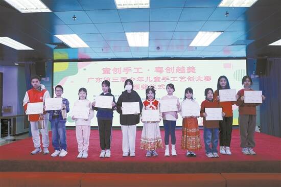 日前,由广东省妇女联合会指导,广东省工艺美术协会、广东省家庭教育研究会、广东省妇女儿童活动中心发展促进会联合主办,广东省工艺美术有限公司等单位承办的“童创手工·粤创越美”广东第三届少年儿童手工艺创大赛落下帷幕。大赛的颁奖仪式和获奖作品展览均在广东省妇女儿童活动中心举行。
