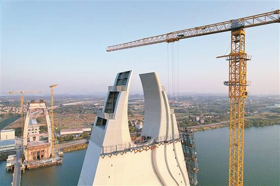 中铁大桥局清花高速项目总工程师路灵伟介绍:目前北江特大桥主塔均已进入上横梁施工阶段,主梁全面转入牵索挂篮施工。