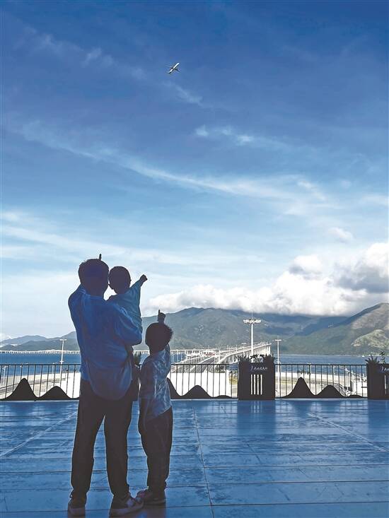 2024年8月9日,我们一家四口游览港珠澳大桥。在蓝海豚岛上,我们和孩子一起数天上的飞机,看着一架架飞机从香港国际机场起飞,直至越过头顶,消失在云中。 投稿人:周bb来啦