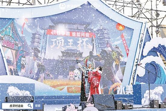 而本次“项王杯”“村运会”还精心策划了一系列配套活动,如“古今项羽”打卡挑战、本地民俗表演、区域网红户外探店旅游以及文创集市特色摊位等。在这里,王者荣耀与项羽典故的主题布置巧妙融合,文创集市及互动游戏摊位不仅营造了跨年游园会的欢乐氛围,更展示了宿迁特色文创产品和丰富的地方特产。游客们在参与中深刻体验到了宿迁深厚的文化底蕴,仿佛穿越时空,与历史英雄项羽并肩作战。这种深度的参与和互动,不仅让乡村运动会成为一场全民的狂欢,也为电竞文化与乡村文化的交融提供了新的可能。