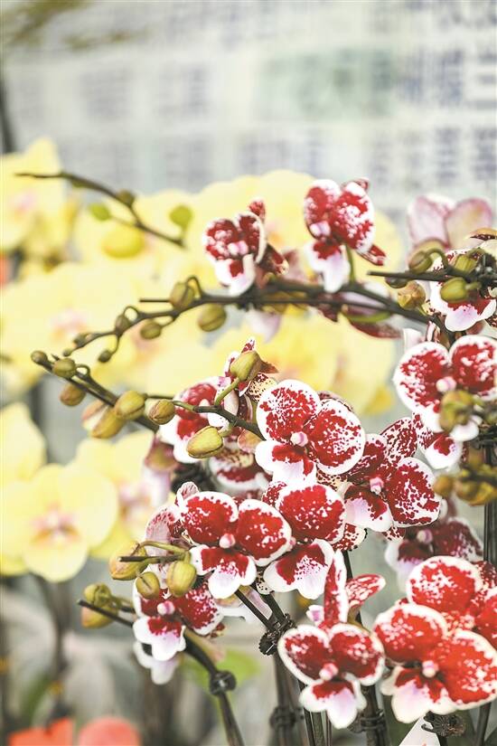 活动现场展出了一批适合办公和家居摆放的年花款式:有广花自主研发培育的新品种系列,如寓意大展宏图的红掌、吉祥如意的粗肋草、风清气正的白掌、鸿运当头的凤梨、财源滚滚的猪笼草,寓意幸福美满的艺术款蝴蝶兰,丰盛祥和的大花蕙兰、好运常伴的冬青、大吉大利的桔子等,“每一款都蕴含着对新一年的美好祝愿,均适合室内各类功能空间、不同装饰风格以及不同尺度空间的摆放。”广州花卉研究中心工作人员表示。现场还展示广州市部分花卉企业自主研发的新品种如蝴蝶兰盆花、鲜切花、捕虫植物以及年宵组合盆栽等,花团锦簇、氛围浓厚。