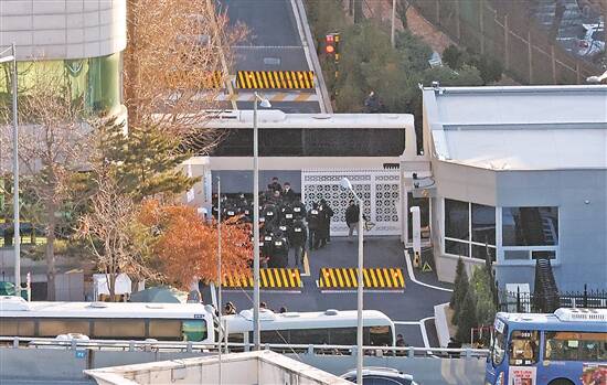 当日上午,韩国公调处工作人员和警方在总统官邸大门外 新华社发