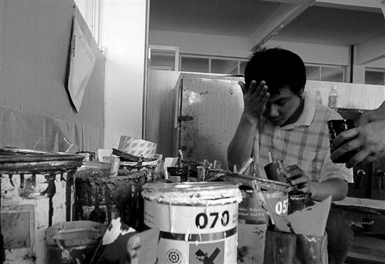 后来在一个学画同学的介绍下,王十月进县城纺织厂当机修学徒。十五六岁,未成年人,干了没多久,车间主任总是骂他笨,受不了这气,就出厂了。又跟一个初中同学出门做小贩,咸宁、孝感,后来到汉阳,做得很失败,同学就说回家吧,王十月坚持留在武汉找工作,差点被骗去黑砖窑厂,半路上他感觉不对劲,逃了。