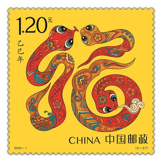 《乙巳年》特种邮票一套两枚,由潘虎、张旺设计。邮票图案名称分别为“蛇呈丰稔”“福纳百祥”。这套邮票以敦煌壁画和传统民俗为灵感来源,将蛇的形象与吉祥寓意巧妙结合,既体现了生肖文化的独特魅力,又凝聚了朴素灵活的民间智慧。两枚邮票不仅是对生肖之美的再次诠释,更是对时和岁丰、福泽四季的深情祝福。