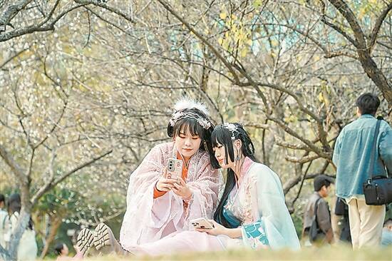 梅花树下,穿着汉服的女生们打卡拍照 羊城晚报记者 贺全胜 摄